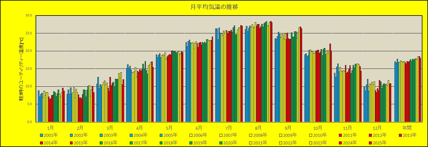 温暖化などを考える参考にと測定しています。空調などのない、北東角の部屋の朝7時ころの気温です。