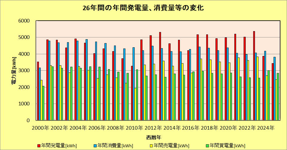 パネルの劣化が始まった2006年から全パネル交換前の2010年までは発電量が消費量を下回っているが、そのほかでは消費量のほうが少ない。