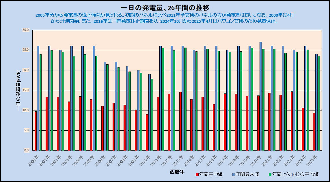 なお、10年ほど前に設置したときの値と比べて、パネル交換後の1日当たりの最大の発電量に大きな違いは認められません。