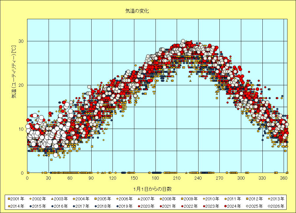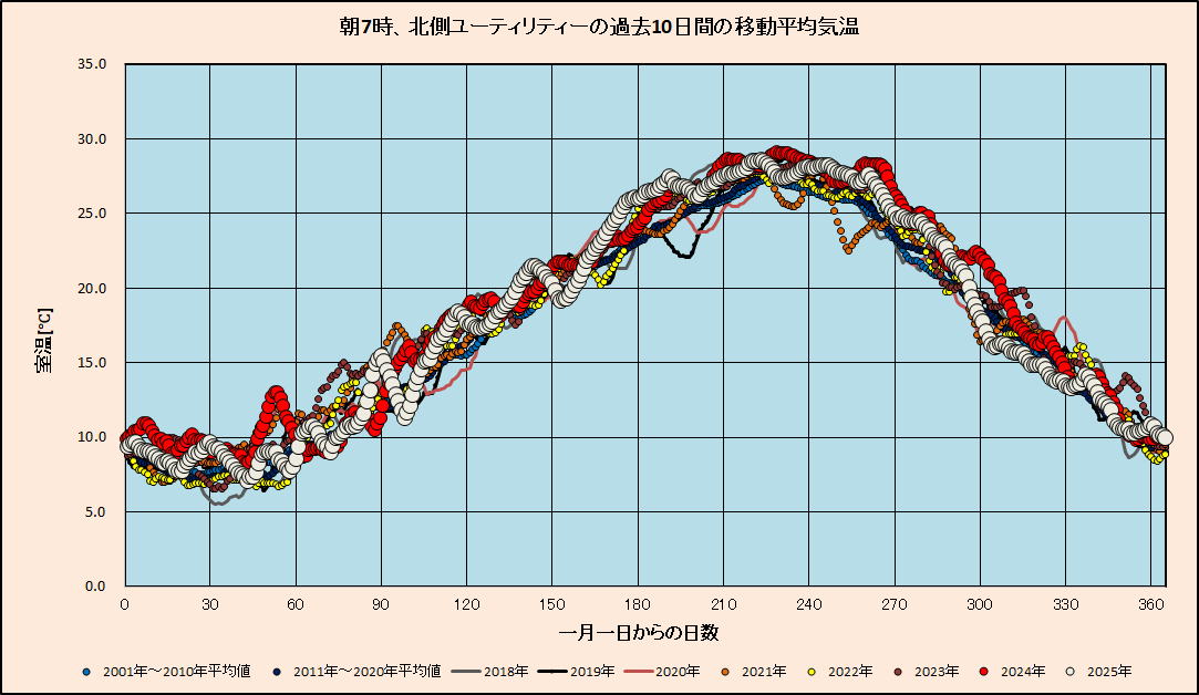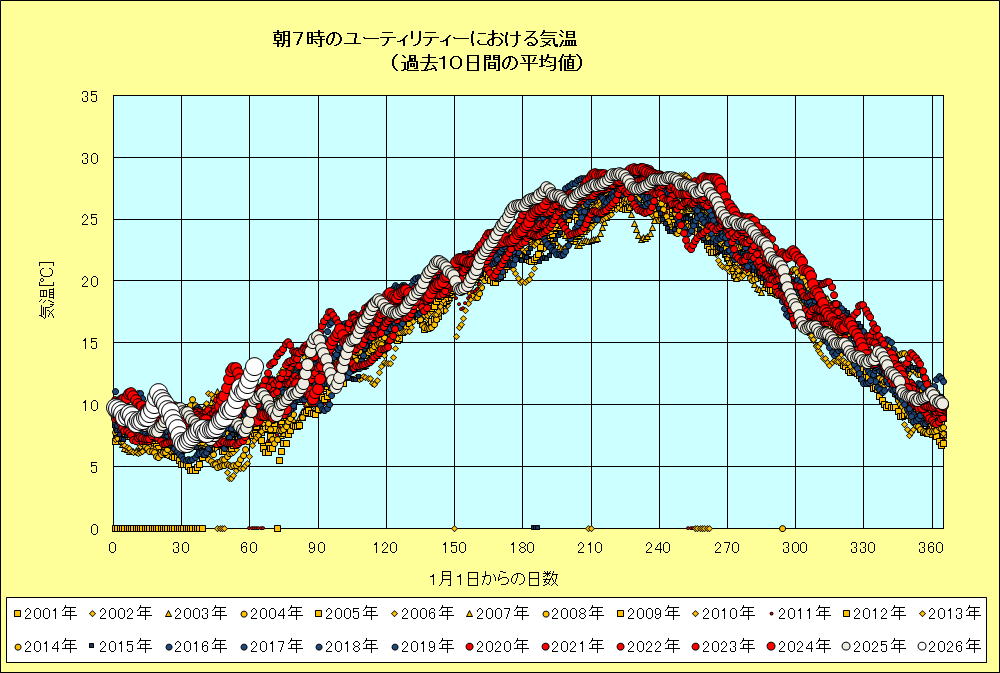 なお、この気温は北側ユーティリティーの朝7時の気温ですから、一日の最低気温の年次変化とみてよいと思います。