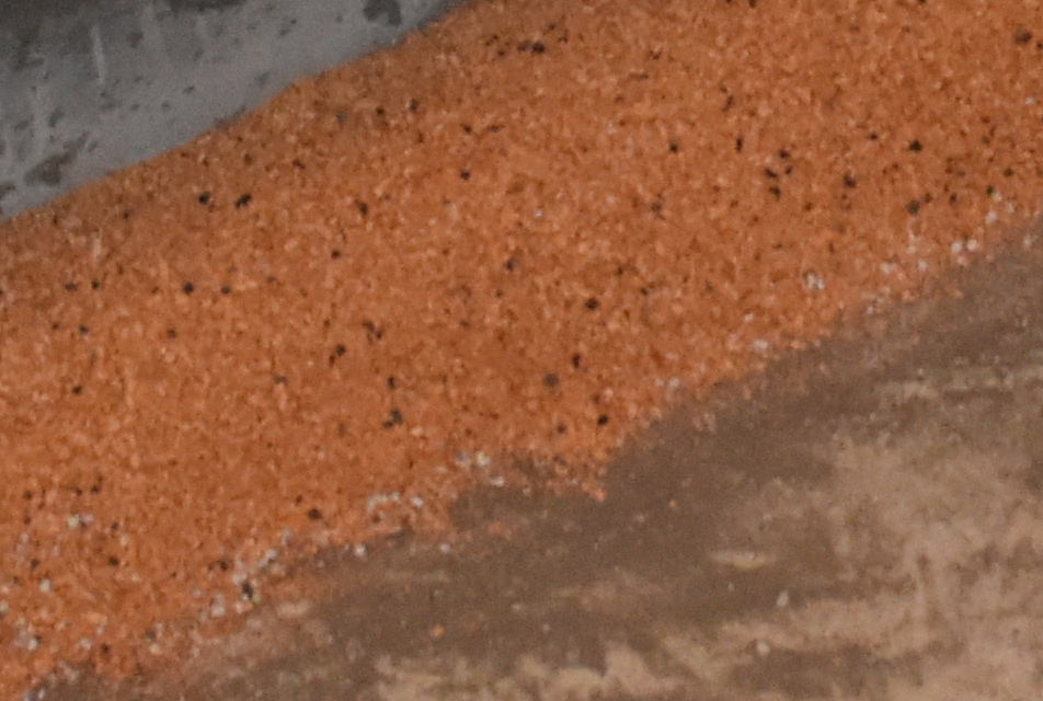 南側の壁のコーキング部も若干膨らんでいるところはありましたが、痛みはほとんど目立った状態ではありませんでした。ダインコンクリートに塗った塗料の白化は見られ、手でこするとご覧のようになりました。